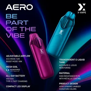 XVape Aero — The Next-Level Disposable ExperienceDesigned for vapers who demand more, the XVape Aero merges sleek design with intelligent performance. Equipped with next-generation nanogrid mesh coil technology, a fully transparent e-liquid tank, and adjustable airflow control, the Aero delivers exceptionally smooth and customizable vapor, elevating every puff. Whether you’re tasting a new XVape flavor or enjoying your daily favorite, it ensures pure, consistent, and satisfying draws every time.Key Features• Adjustable Airflow Control – Seamlessly switch between a tight MTL draw and an airy DTL pull to match your personal preference.• Nanogrid Mesh Coil – Engineered for rich vapor production and cleaner flavor, evenly heating every drop for maximum intensity.• Transparent E‑Liquid Tank – Keep track of your juice level at a glance—no surprises, no dry hits.• Minimalist LED Display – Stay informed with a clear, intuitive display showing battery life and puff status.• 650mAh Rechargeable Battery – Reliable all-day power that keeps up with your sessions, on the go or at home.Designed for Your Flavor JourneyThe XVape Aero brings together innovation, style, and performance in one refined device. Its adjustable airflow, advanced mesh coil, and crystal-clear tank work in harmony to unlock the full character of every XVape flavor. Explore the XVape Flavor Guide to find your perfect pairing, and take your vaping to new heights. For those who seek smoothness, control, and premium taste in a sleek and portable form—the Aero is your ideal companion.