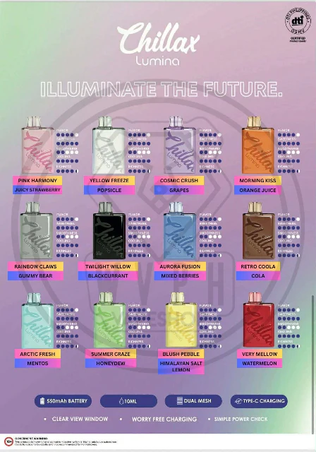 Introducing the Chillax Lumina – the new chapter in the chillax vaping journey. Crafted for those who seek top-tier performance without the fuss, Lumina offers robust flavor, exceptionally smooth draws, and enduring satisfaction, all housed in one sleek, contemporary disposable. Whether you’re moving up from the Chillax Vista, captivated by the stamina of Chillax Infinite, or a fan of the straightforward ease of Chillax Go, the Lumina unites the finest qualities of each into one formidable device.